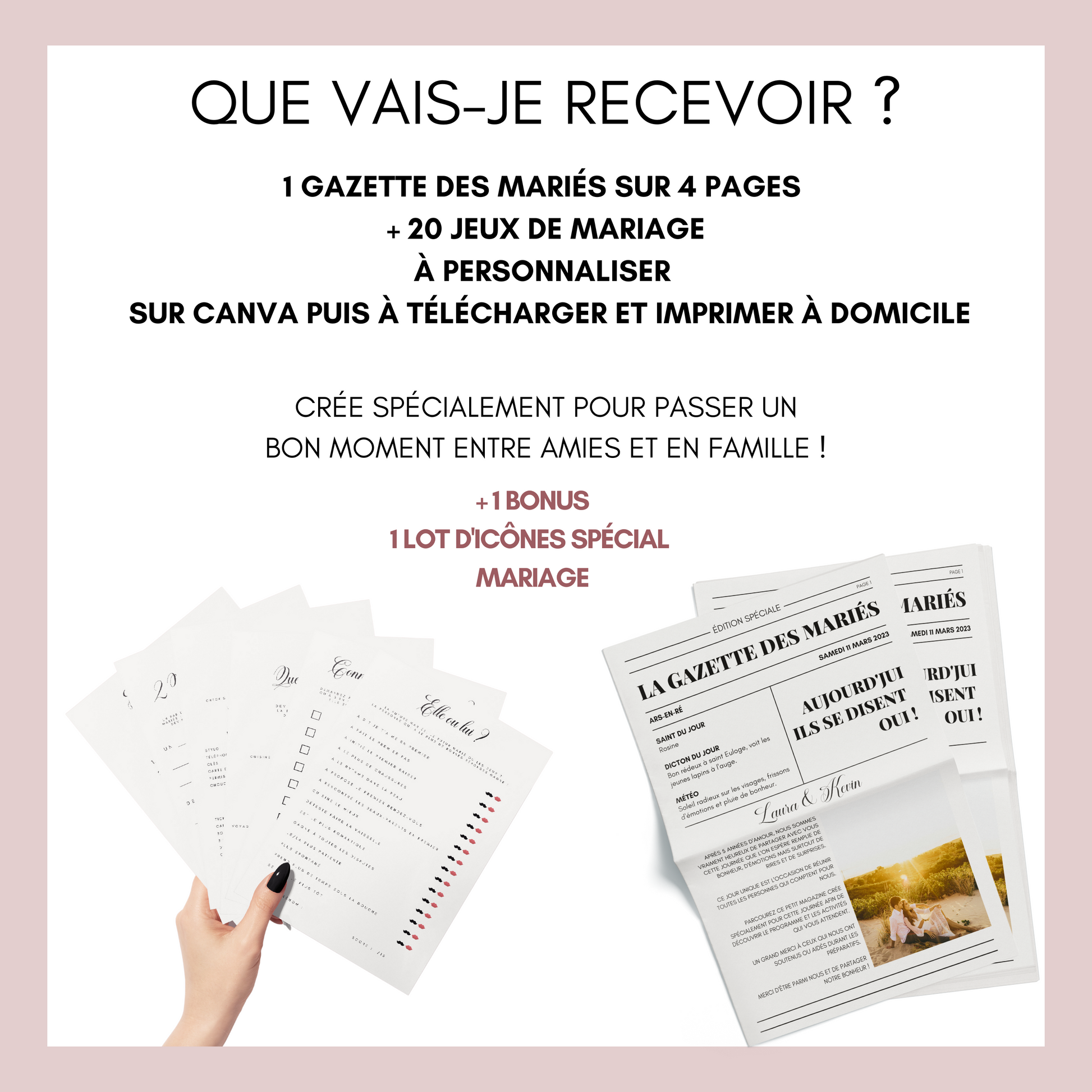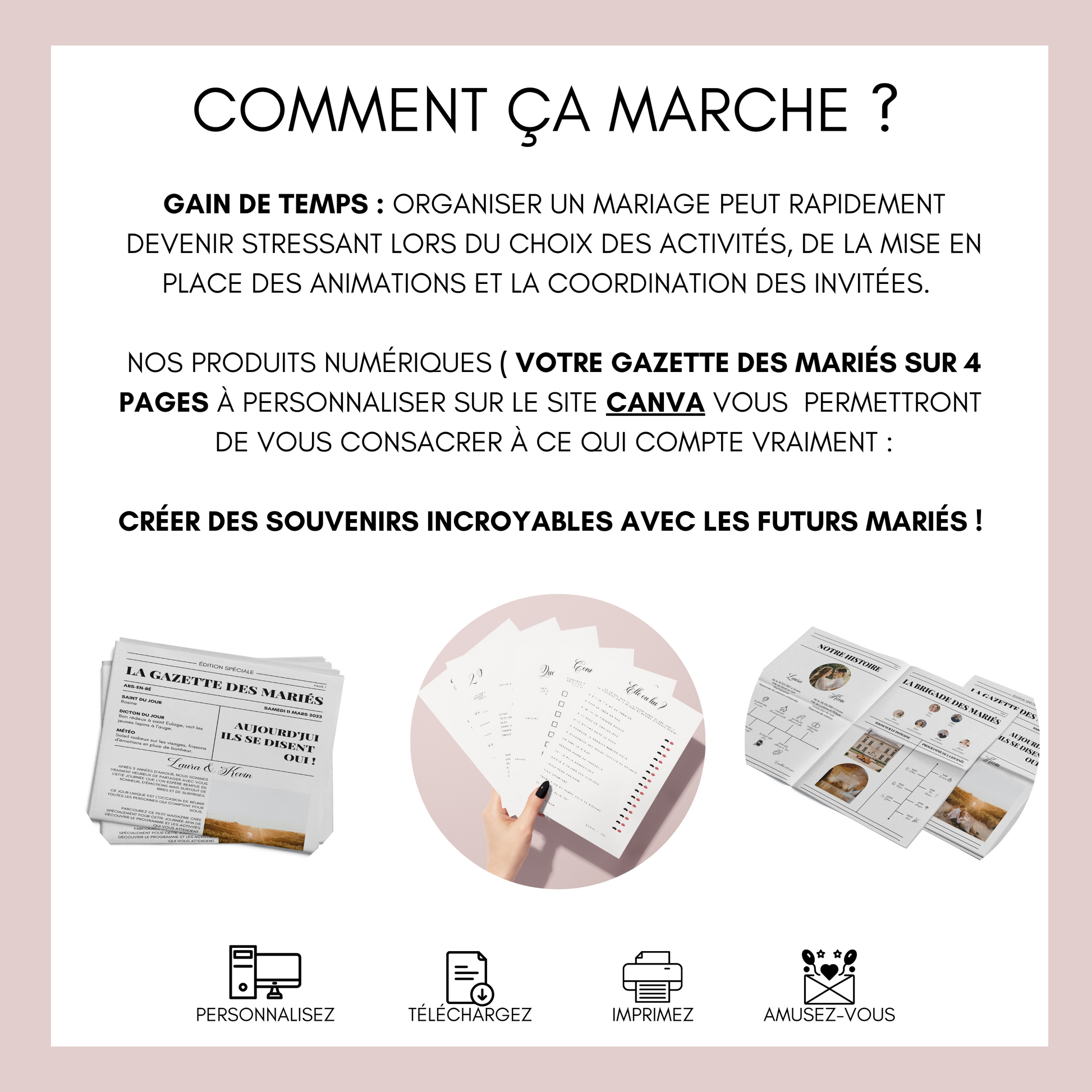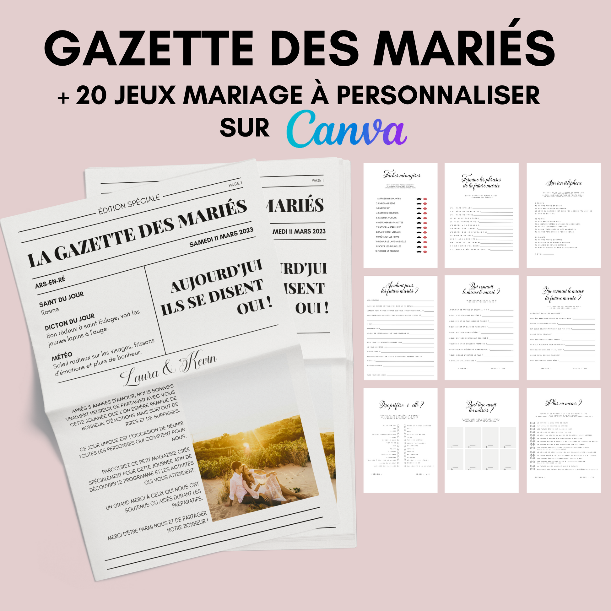 Gazette des mariés - Rendez votre Mariage Inoubliable avec notre Gazette des mariés et une Sélection de 20 Jeux à personnalisée sur Canva !