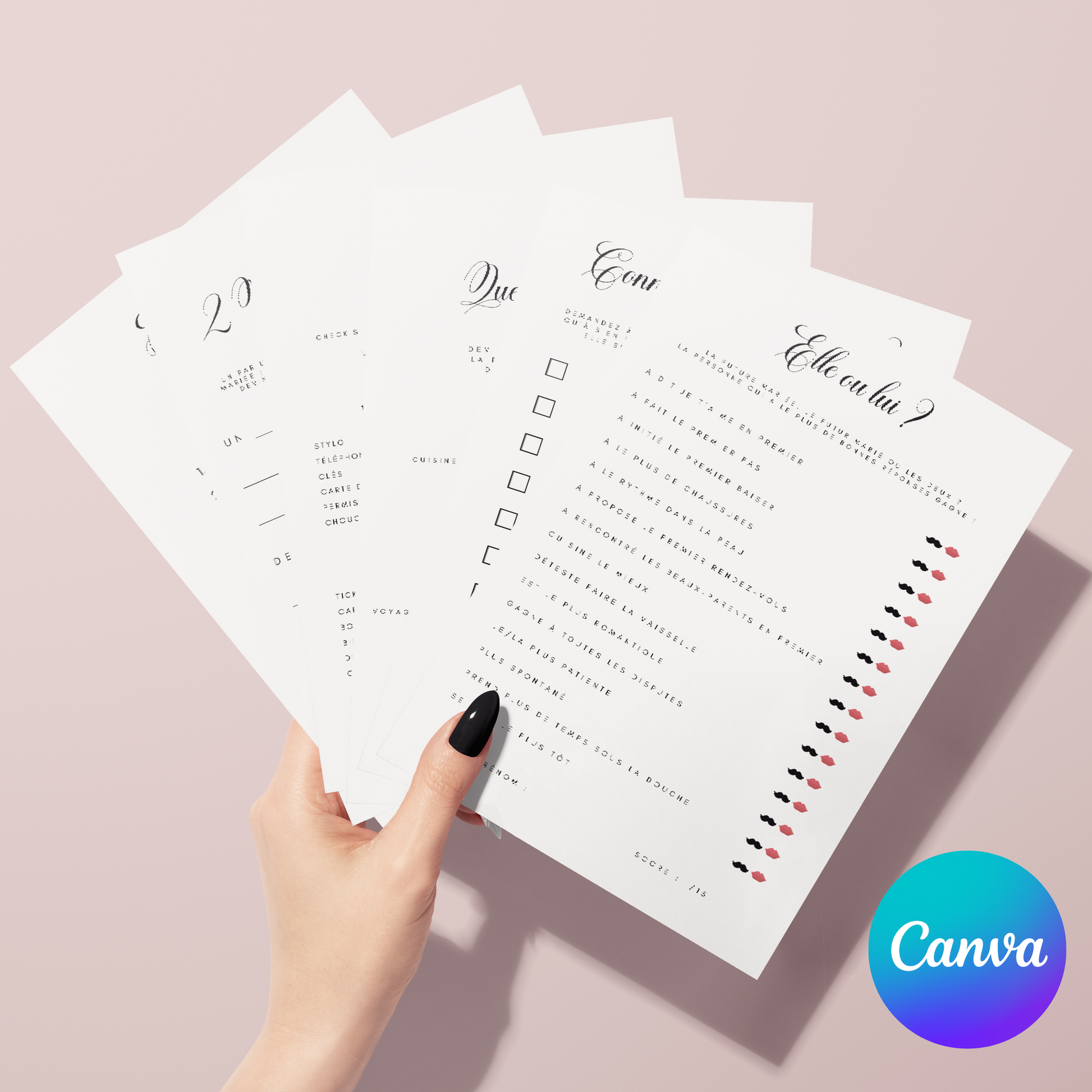 Simplifiez l'organisation de votre mariage avec notre pack complet comprenant une gazette des mariés personnalisable sur Canva et 20 jeux de mariage. Cette solution tout-en-un vous permet de créer des souvenirs uniques tout en divertissant vos invités.
