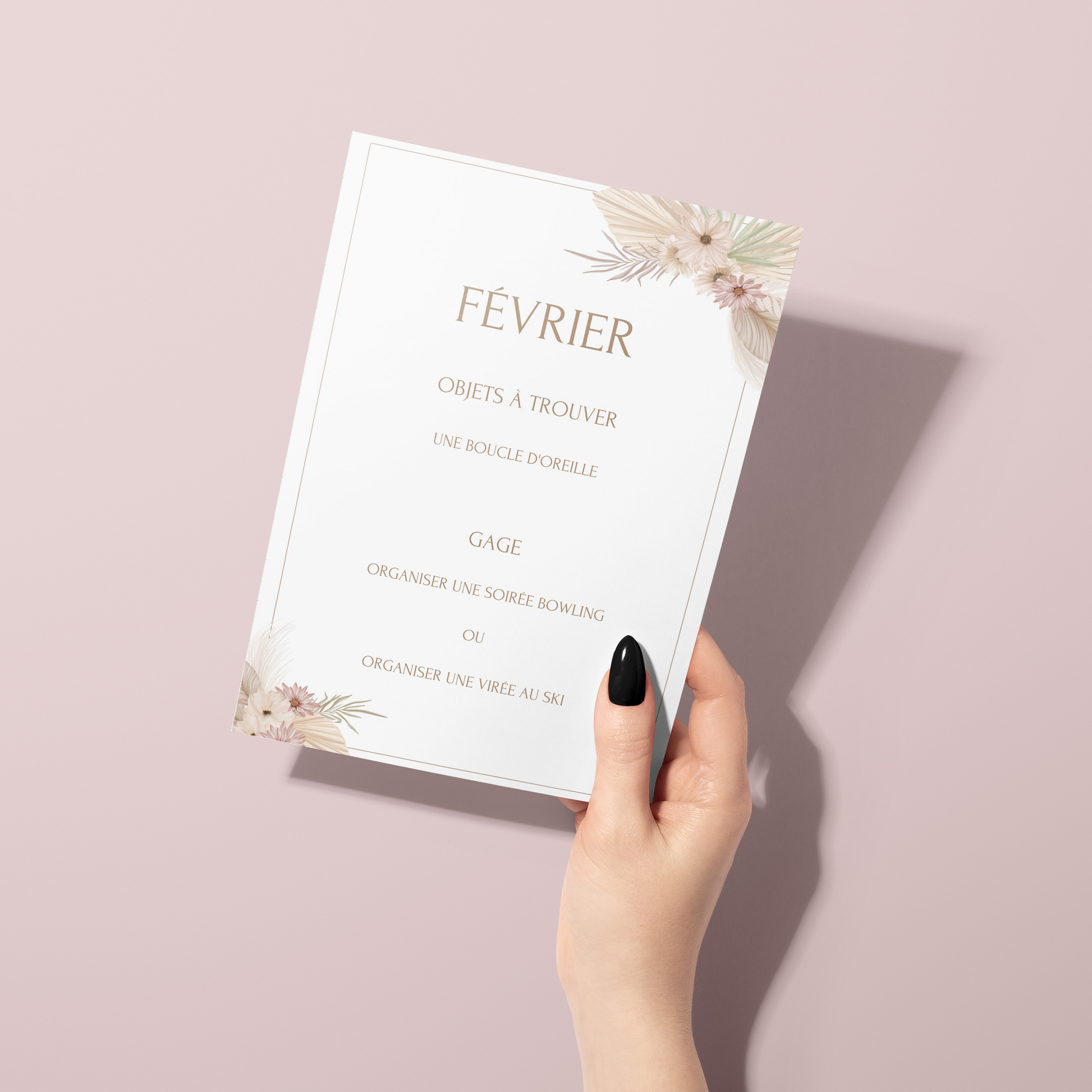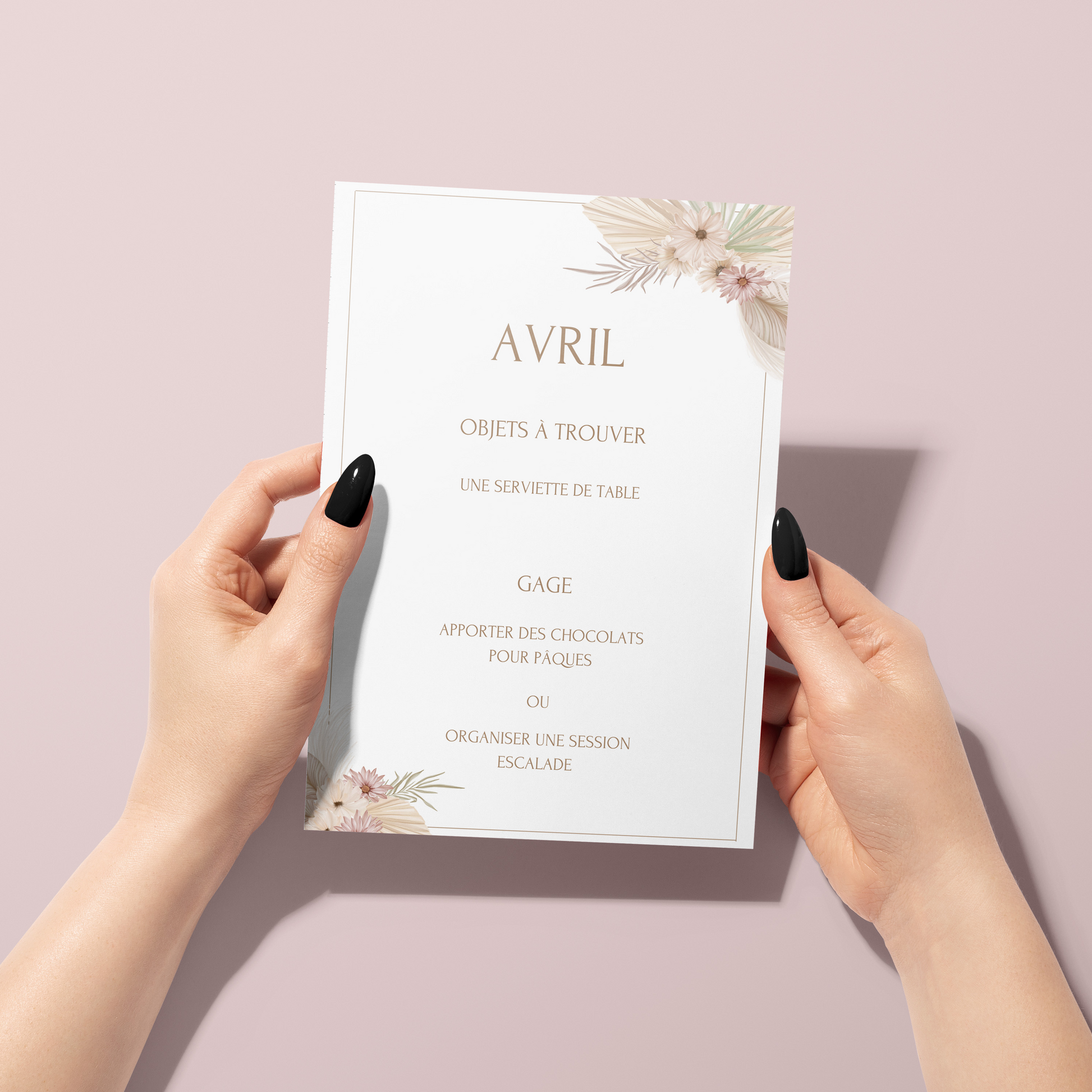A noter : Les gages présents dans chaque pack sont identiques. Seul le thème varie, afin de s’adapter à différents types d’événements. Parmi les thèmes proposés : fleuri, eucalyptus, et d’autres encore.