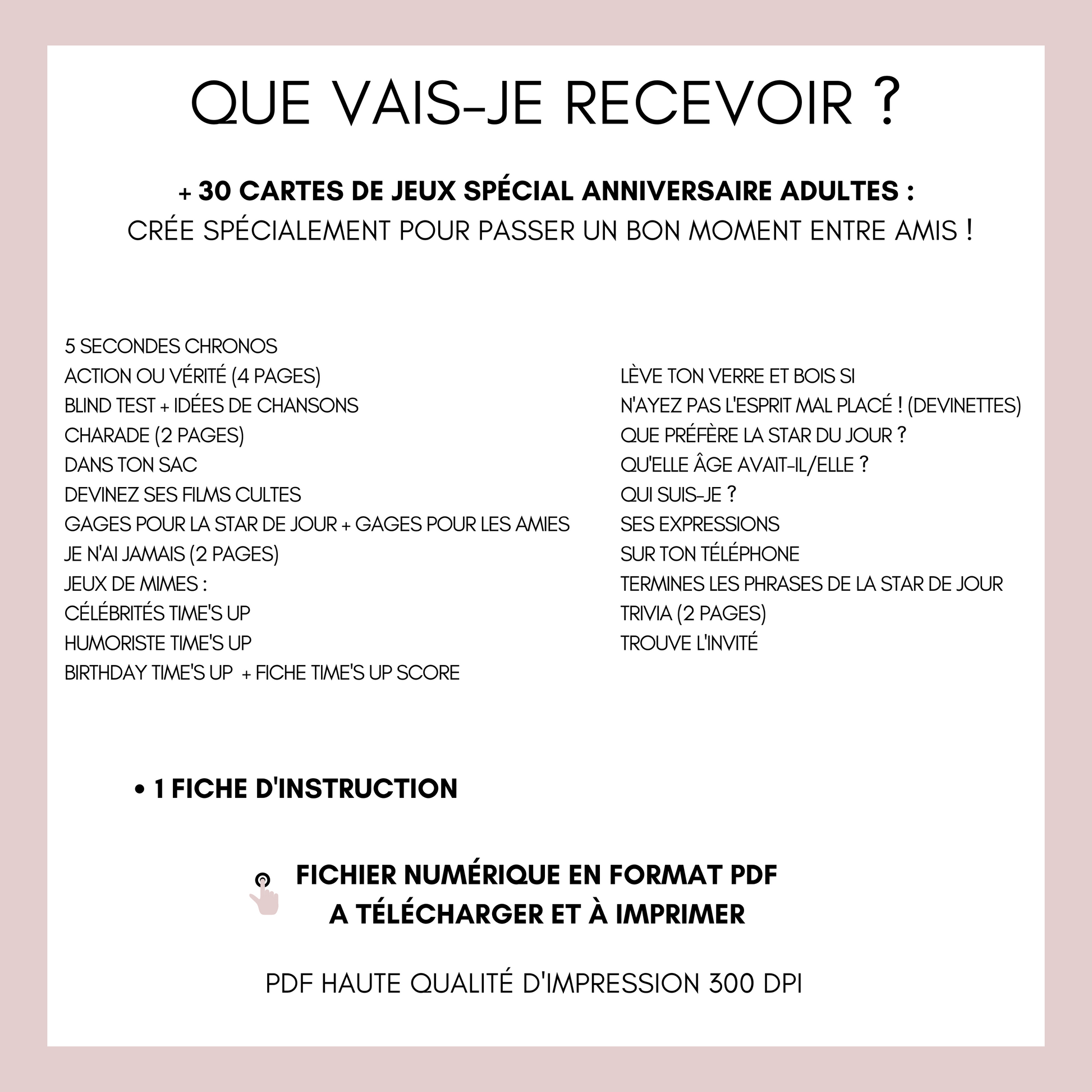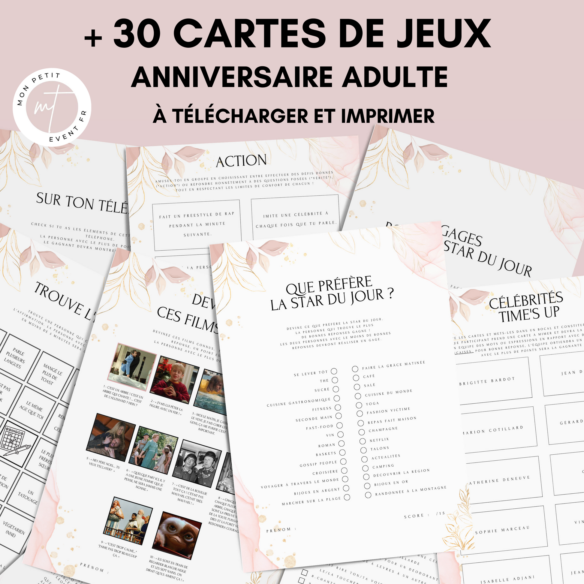 Notre collection exclusive de jeux d'anniversaire pour adultes a été conçue pour créer une ambiance festive et mémorable. Ces jeux téléchargeables et imprimables instantanément facilitent l'organisation de votre célébration tout en garantissant des moments de partage uniques entre amis et famille.
