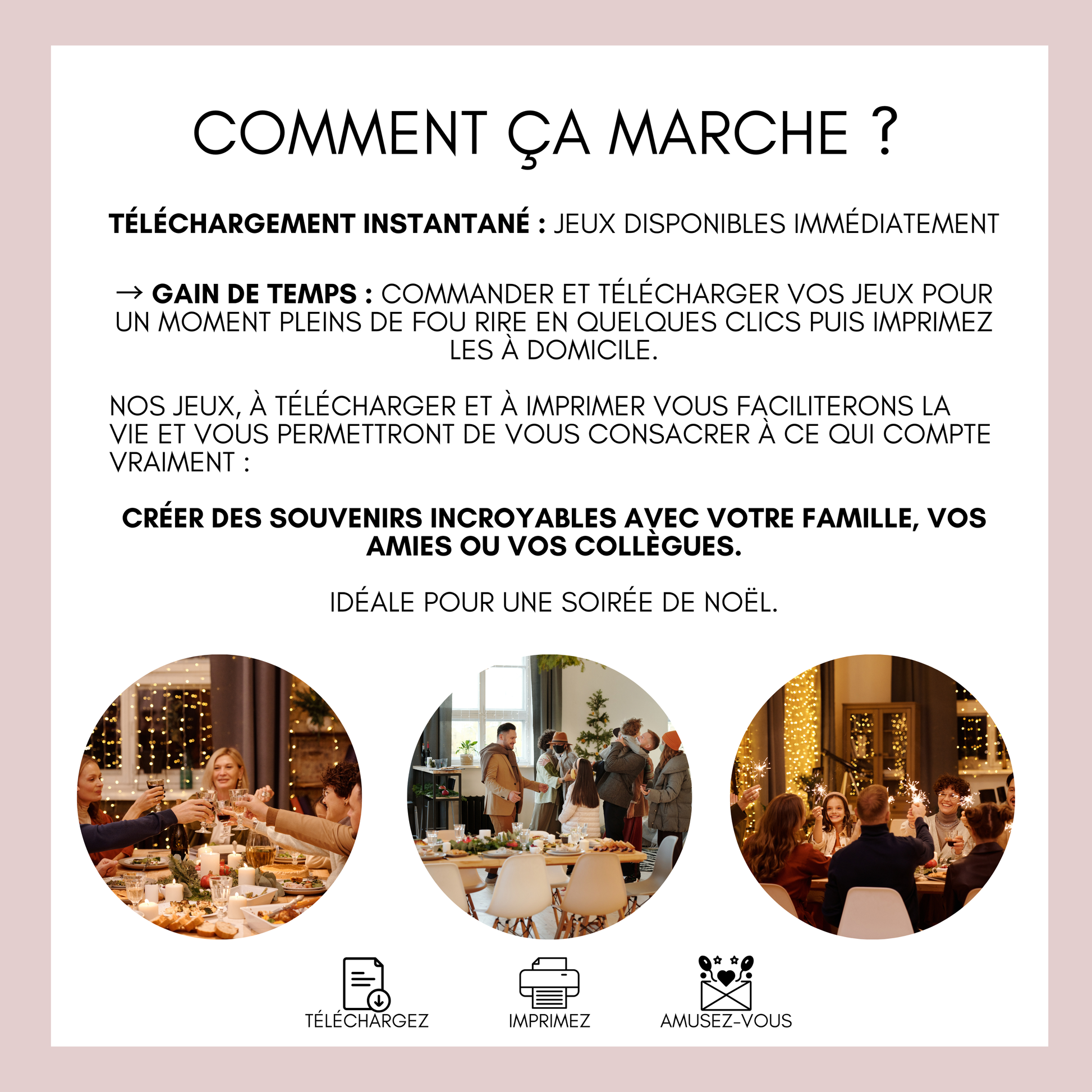 Transformez vos soirées de fêtes en moments magiques grâce à ce pack complet de jeux de Noël à télécharger et à imprimer. Parfait pour partager des instants de rires et de convivialité en famille ou entre amis pendant les fêtes de fin d'année.
